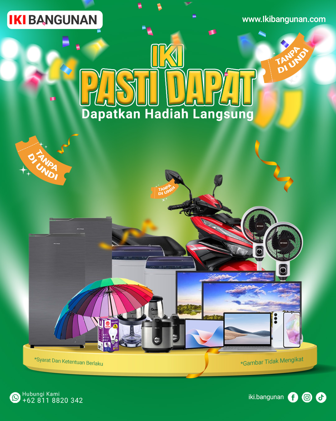 Langsung bawa pulang hadiah keren dari kulkas, kipas angin, sampai motor, TANPA DIUNDI! 😍 Gimana caranya? 1️⃣ Belanja yang ditentukan dan kebutuhan bangunanmu di IKI Bangunan 2️⃣ Nikmati hadiah langsung sesuai syarat & ketentuan